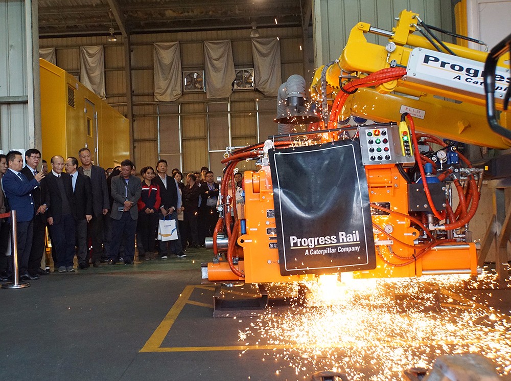 在啟世機械的焊軌機車間,與會代表觀看了采用烏克蘭巴頓電焊研究院焊接專利技術(shù)的BHP澳洲標準焊軌機現(xiàn)場焊接演示。